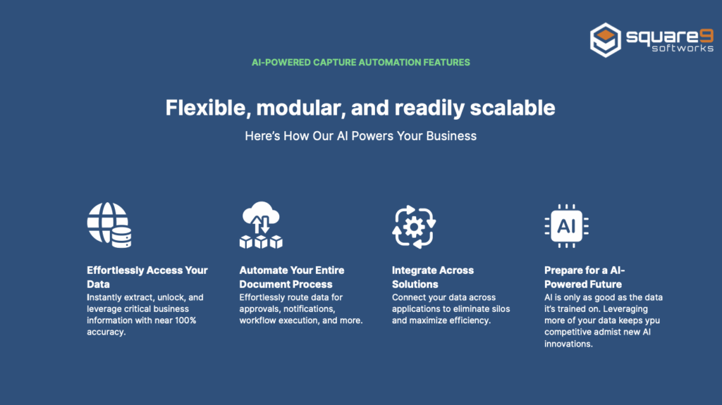 Square 9’s AI-driven platform transforms the way you access, extract, and activate information so that you can move from insight to action faster than ever before. Extract high-value data from any source document, including headers, footers, line items, and even handwritten notes. No manual entry. No delays. Just the right information, exactly when and where you need it.
